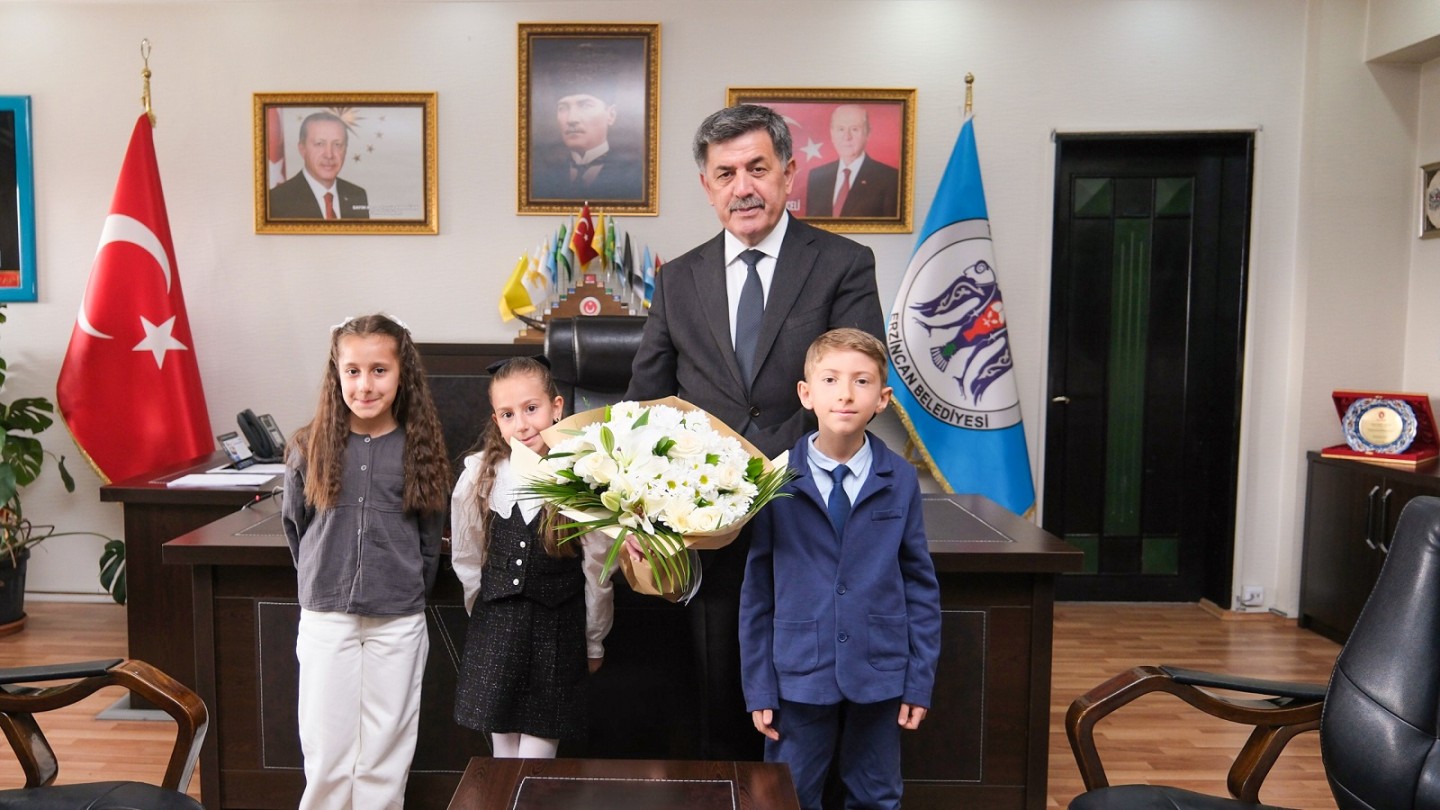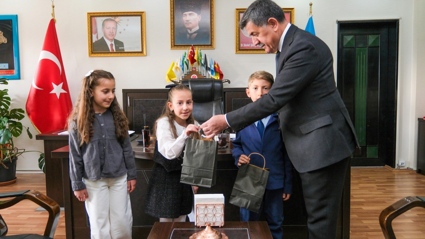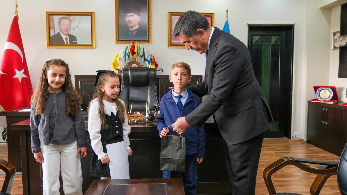 Gelecek nesillere verilen önemin ve güvenin simgesi olan 23 Nisan Ulusal Egemenlik ve Çocuk Bayramında, Salih Erkan İlkokulu öğrencilerinden Elif İkra Yıldız, Ahmet Mete Köksal, Nazen Ece Karakaya, Okul Müdürü Mutlu Mayda, Sınıf Öğretmeni Özge Kurt Gülfırat Belediye Başkanımız Bekir Aksun’a ziyarette bulundular.