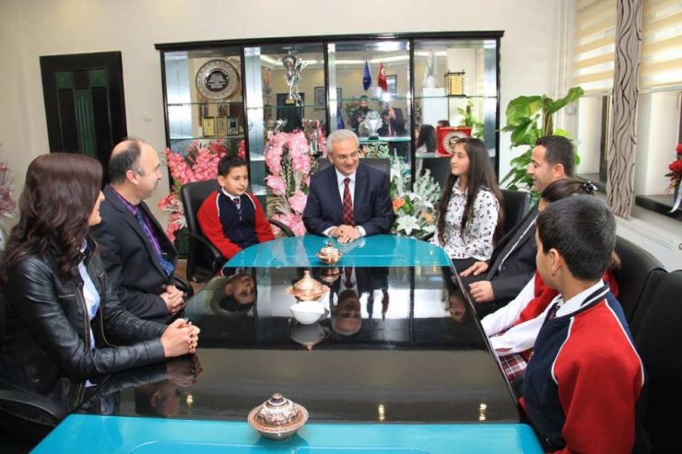 Başkanlık makamında bir süre öğrencilerle sohbet eden Başsoy, daha sonra kendisini ziyaret eden öğrencilere hediyeler verdi.