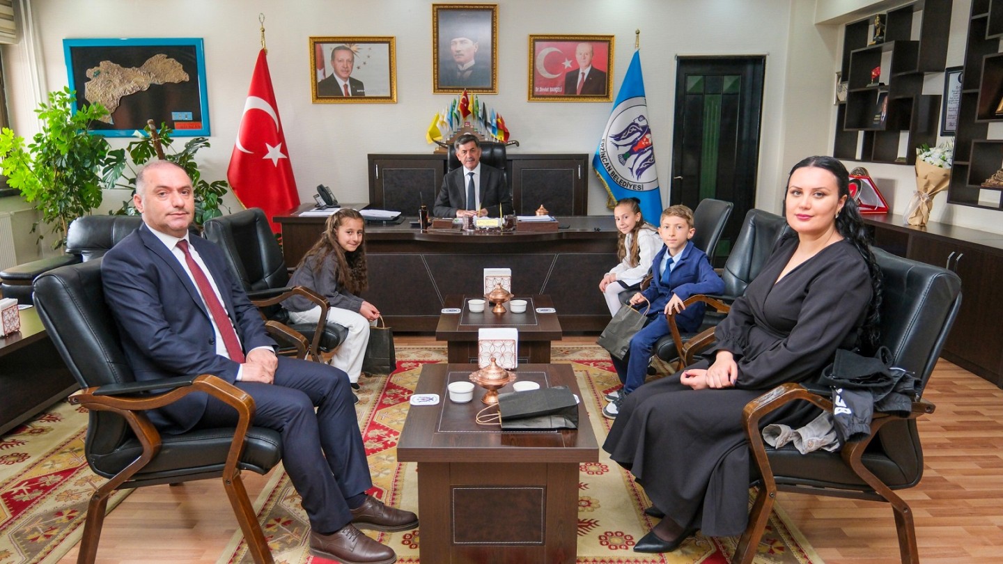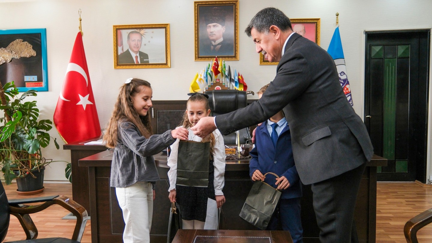 Gelecek nesillere verilen önemin ve güvenin simgesi olan 23 Nisan Ulusal Egemenlik ve Çocuk Bayramında, Salih Erkan İlkokulu öğrencilerinden Elif İkra Yıldız, Ahmet Mete Köksal, Nazen Ece Karakaya, Okul Müdürü Mutlu Mayda, Sınıf Öğretmeni Özge Kurt Gülfırat Belediye Başkanımız Bekir Aksun’a ziyarette bulundular.