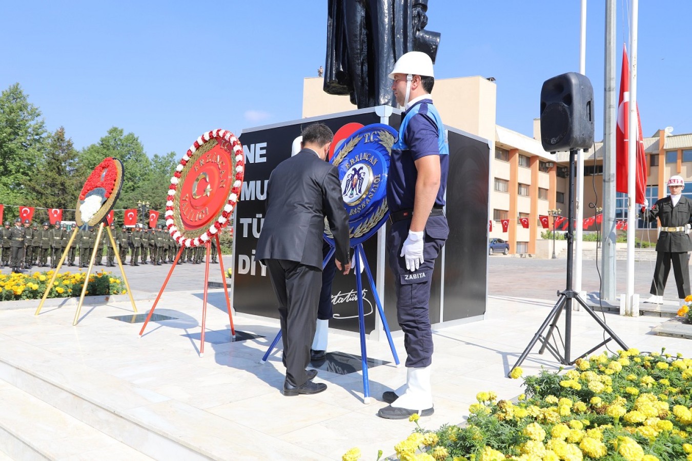 Atatürk Anıtına Erzincan Valisi Hamza Aydoğdu, Garnizon Komutanı Tuğgeneral Cem Kamil Sağcan ve Belediye Başkanı Bekir Aksun tarafından çelenkler sunuldu ve ardından saygı duruşunda bulunularak İstiklal Marşı eşliğinde Bayrağın göndere çekilmesi ile tören sona erdi.