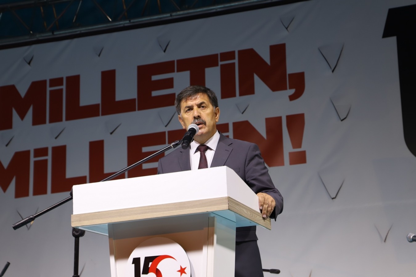 Tam dört yıl önce, Türk Silahlı Kuvvetleri’nin içine sızmış dış güçlerin ipoteği altındaki dar bir kadro devleti işgal, iç barış ve huzur ortamını imha etmek için harekete geçmiştir. Milli birlik ve beraberliğimiz üzerinde hesap yapanlar, Türk Milleti'nin varlığına, birliğine, dirliğine ve tarihsel sürekliliğine kanlı cephe açan iç ve dış işgal güçleri FETÖ’yü kullanıp silahlandırarak emellerine ulaşmak istemişlerdir. O hain gecede tüm kurumlarımızın koordinasyonu, vatan paydasında buluşan tüm siyasi partilerimizin ve sivil toplum kuruluşlarımızın mensuplarının birlikteliği yeni bir ruh ve heyecan kazandırmıştır. Bu ruh ve heyecanla Türk Devletinin ve seçilmiş hükümetinin yanında yer alan, demokrasimiz ve cumhuriyetimizin kazanımları için sabahlara kadar gözünü kırpamadan demokrasi nöbetleri tutan , birlik ve beraberliğimize sahip çıkan kalbi vatan için atan Erzincanlı hemşehrilerimi saygı,sevgi ve muhabbetle selamlıyor,sonsuz şükranlarımı sunuyorum.