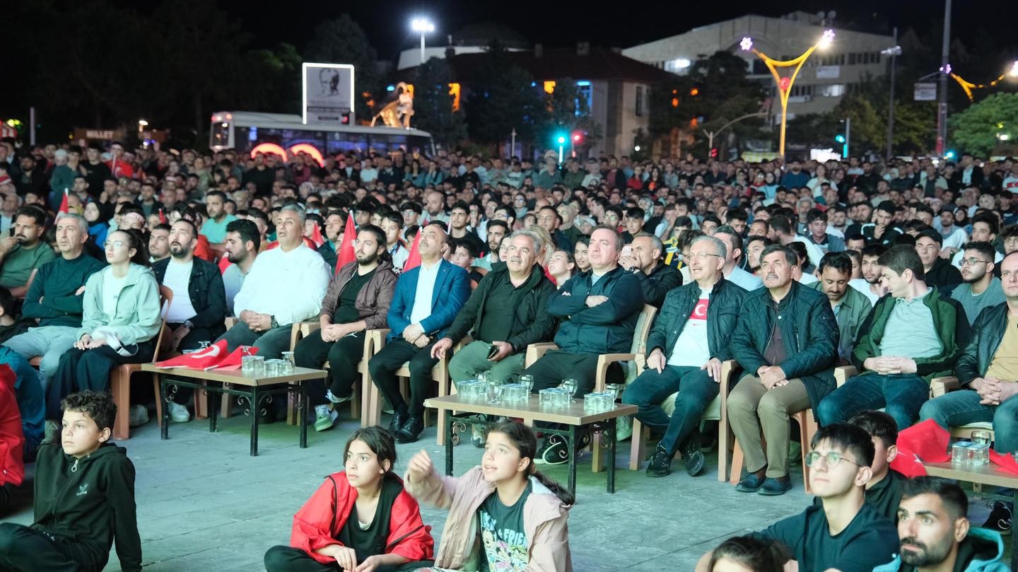 Belediye Başkanımız Sn. Bekir Aksun, Erzincan Valisi Sn. Hamza Aydoğdu, Protokol üyeleri ve meydanda bir araya gelen vatandaşlar ile birlikte Milli Takımımızın mücadelesini heyecan ve coşkuyla takip ediyor.