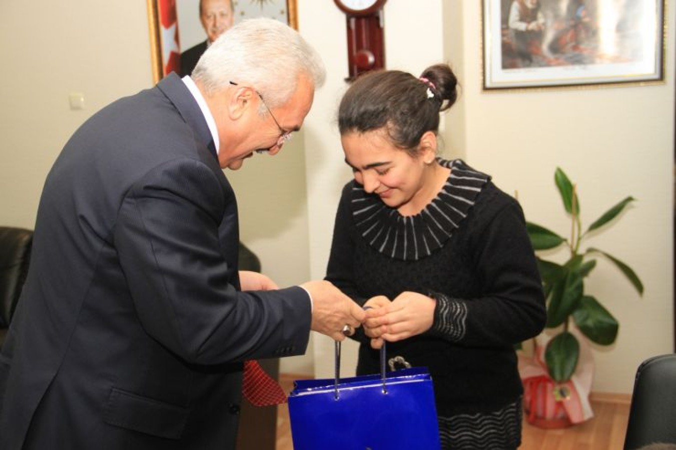 Başkan Başsoy daha sonra Busnur’a ve kardeşlerine çeşitli hediyeler verdi.