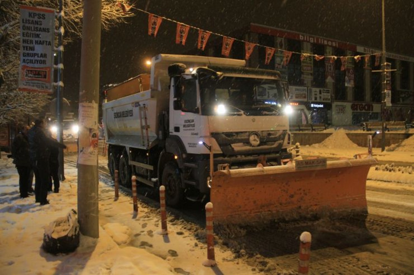 Erzincan’ da akşam saatlerinde başlayan kar yağışı sonrası Erzincan Belediyesi kar temizleme ve tuzlama çalışmalarına eş zamanlı olarak başladı.