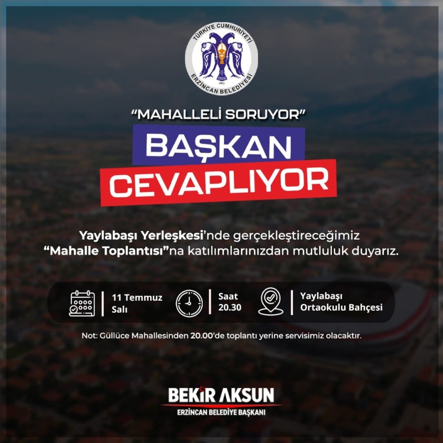 Belediye Başkanımız Sayın Bekir Aksun “MAHALLELİ Soruyor, BAŞKAN Cevaplıyor” programları kapsamında bu hafta Yaylabaşı Yerleşkesi sakinleri ile bir araya gelecek.