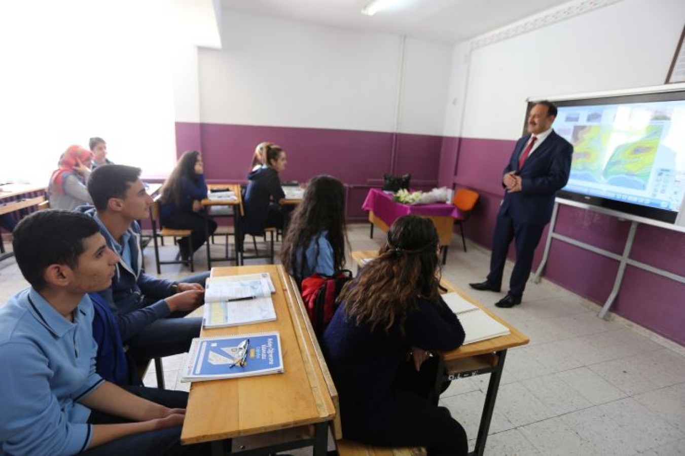 Okul Müdürü Hamza Yılmaz’ın makamında bir süre sohbet eden Başkan Yardımcısı Atıcı Daha sonra okulun en tecrübeli öğretmeni olan Ayşe Yalçındağ’ın ders verdiği sınıfa giderek ona çiçek takdim etti ve öğretmenler gününü kutladı.