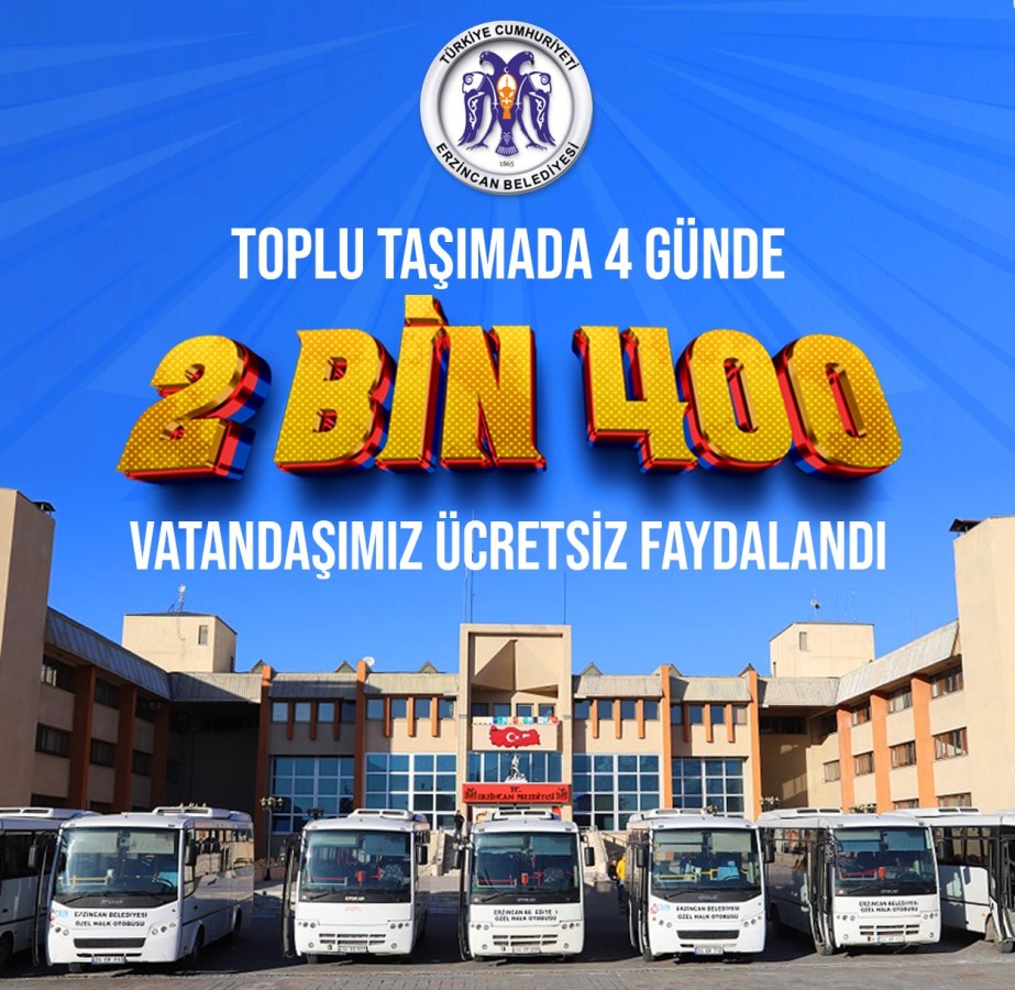 Çalışmalarını vatandaş ve hizmet odaklı sürdüren Erzincan Belediyesi olarak toplu taşıma işine başlayalı henüz bir hafta bile olmamışken yaklaşık 10 Bin vatandaşımıza taşıma hizmeti verdik ve bu vatandaşlarımızdan 2 Bin 400 kişiyi ise ücretsiz taşıdık.